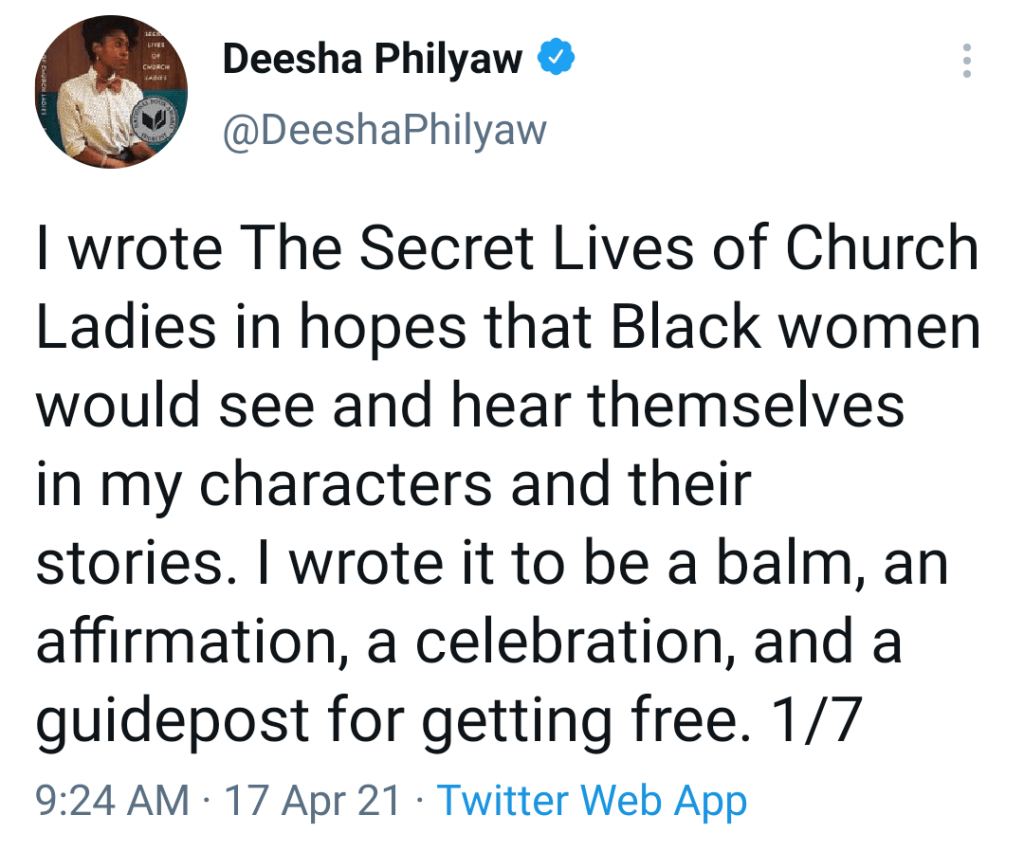 The other six stories, though, left me with a pervasive sense of “that’s it?” Reviews and the author herself promised a collection of joy and self-identification. I found a lot of it trite and trope-ish instead. Aggrieved light-skinned country mothers having affairs with married church men who neglect their dark-skinned, insecure daughters seem to be a running theme in over half the stories and c’mon now–are we still doing that? What year is it? Men are worshipped as gods, despite being remarkably unlikable and unpleasant in nearly all their appearances. Queer women are well-represented, but in perpetually dysfunctional, emotionally stunted ways. Also, there’s a surprising lack of breadth of perspective too–none of the stories are from the viewpoint of a female pastor, a first lady, or someone who is at all grounded, progressive, or agencied in their faith or even their life. Church functions as a bland stand-in for misogynoir in these stories and while that’s valid, it wasn’t presented with enough depth or scope outside of the worst of church for me. I didn’t really see myself or any of the other Black women I know–churched or unchurched–reflected in most of these stories, only sad, mulish caricatures. I expected more inner life, more surprises, and more types of women.