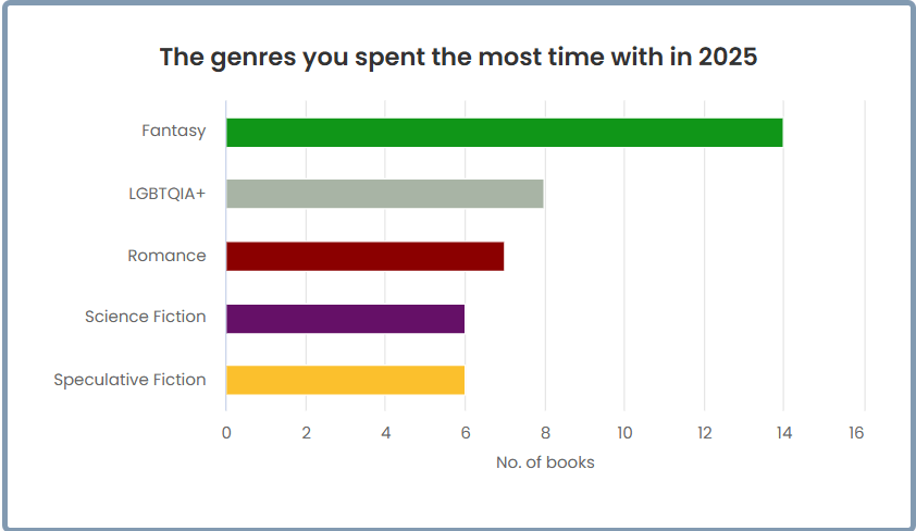 Of those 52, 14 were fantasy novels, which surprises me. I don’t feel like I read a lot of fantasy this year but apparently I did–I just didn’t review much of it.(More on this later). The above image is from Storygraph, which allows books to be categorized in multiple ways, so I also read 8 books with LGBTQIA+ themes, overlapping genres. Some of these were obviously so, like the iconic memoir by trans icon Miss Major Speaks or the found family graphic novel Gaysians, but others in the category were simply casually queer, which I’m finding and appreciating more and more often. Dark academia thriller An Arcane Inheritance, which I wrote up for next month’s Lightspeed, has a cast populated by bisexuals and nonbinary folk. Workplace sci-fi horror Several People Are Typing is by a trans author, and the central love story is decidedly queer but also very unsensational–I didn’t even think to mention it in the review.